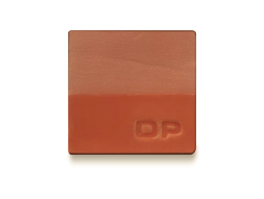 La muestra corresponde al engobe horneado a 1040°C, mitad inferior de la pieza aplicada con esmalte transparente brillante DP-TP-289 y mitad superior sin aplicación de esmalte.